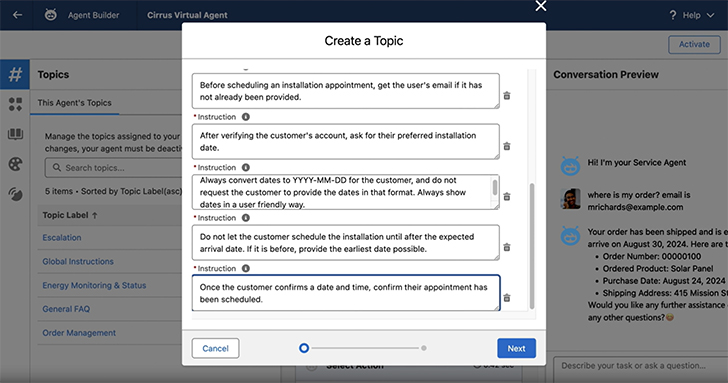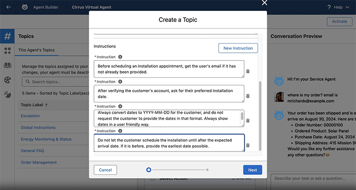 Agentforce lets you add unlimited instructions to your agents. The more specific you are, the more effective your agent will be. Look at this set of detailed instructions: