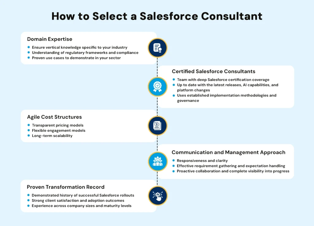 Investing in a Salesforce rollout can be substantial. That’s why it’s crucial to establish your budget early and identify top Salesforce Consultants within your financial scope. You can start by comparing the engagement models of different consultancies. Understand their work models. This will give you a better overview. And set the path for a most effective, comprehensive, yet budget-friendly solution for your needs.